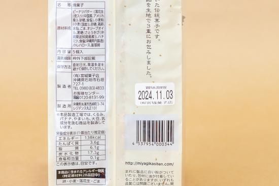 ピーナッツバター(落花生(中国産・アメリカ産)砂糖・塩)、小麦粉、砂糖、鶏卵、水飴、胡麻、オリーブオイル、黒糖(さとうきび(沖縄波照間島産))・ハチミツ、食塩(沖縄県内製造)/トレハロース、膨張剤 |